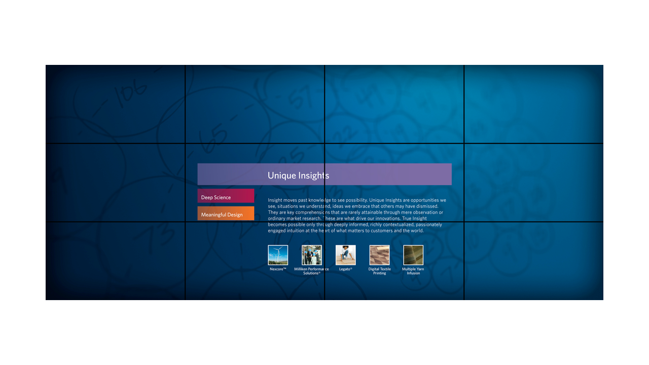 Milliken is one of those companies that you’ve probably never heard of that makes the things inside the everyday things you know. The South Carolina-based company asked Salt Branding and ALD to create the user interfaces and key content for their touch walls and touch table to live in their corporate campus Innovation Gallery. Introducing the deep south to cutting-edge large-scale touch screen interfaces made a big, technical, graphic statement about Milliken’s commitment to innovation and the forward-thinking minds that comprise their company—and further elevated all of the Milliken scientists and products being showcased on the big screens.