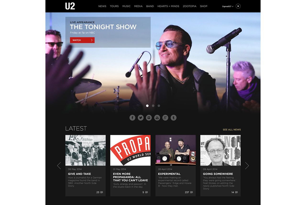 U2 asked us to rethink the structure and design of their web presence ahead of their latest album launch and tour. Working directly with band management and Live Nation, we focused on the live experiences that are so central to the band’s appeal, and on paying reverence to their significant and truly singular history.