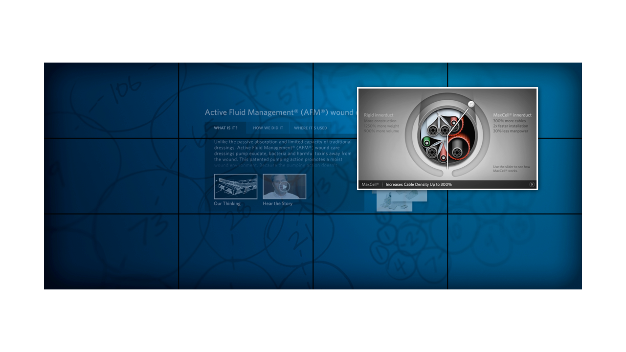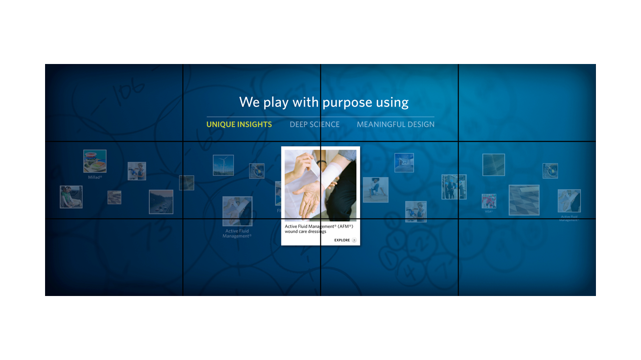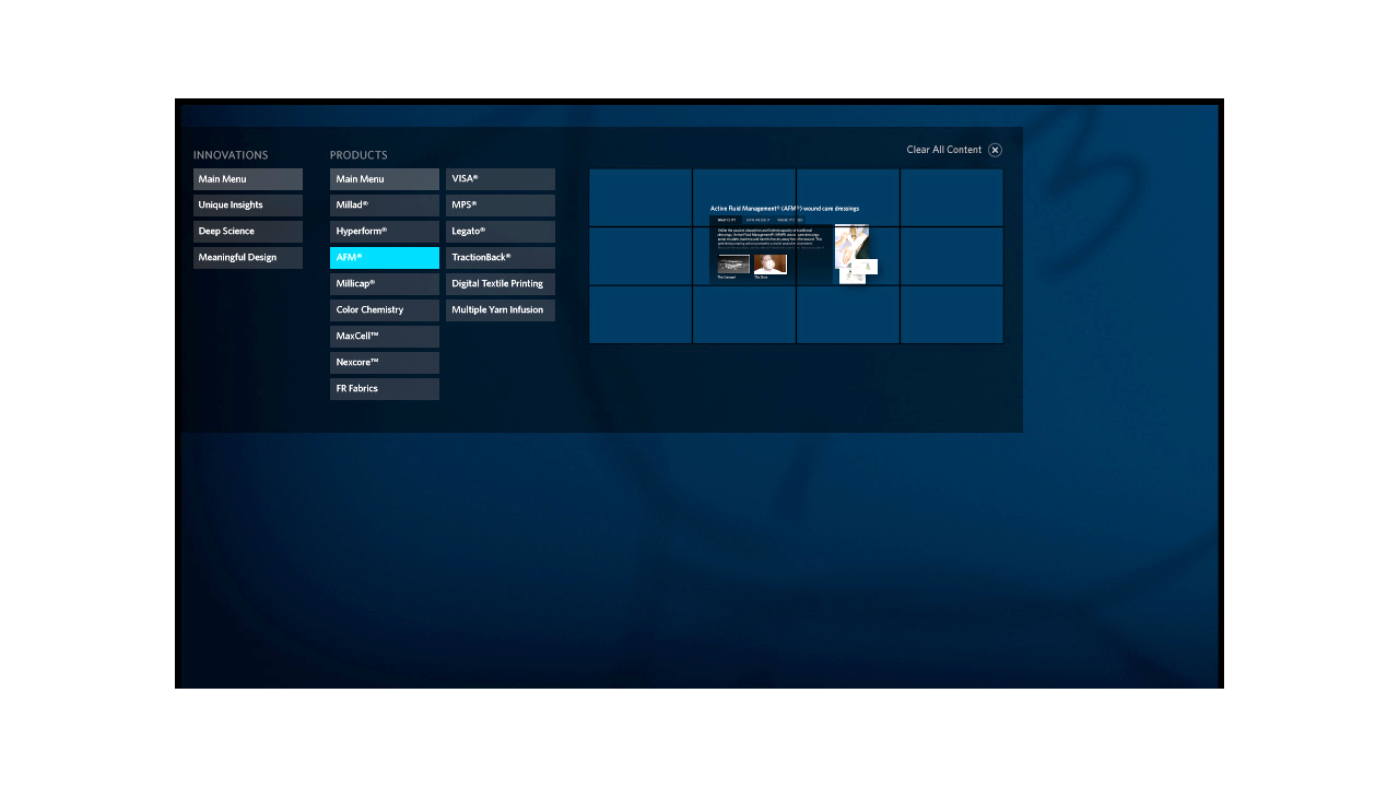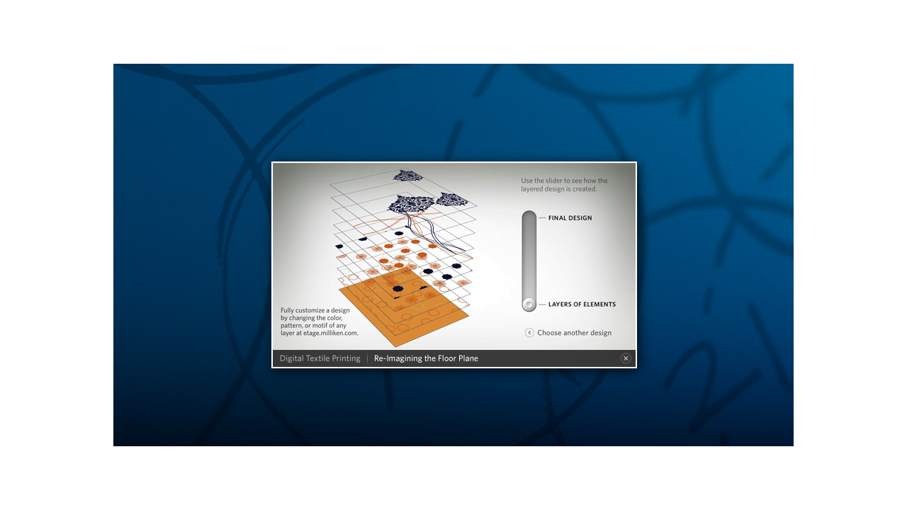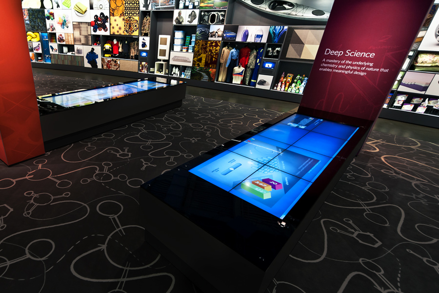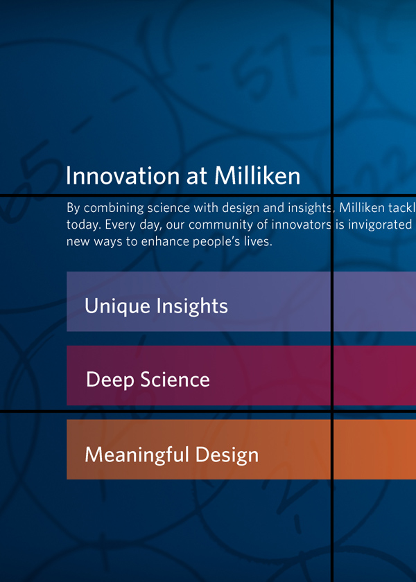 Milliken is one of those companies that you’ve probably never heard of that makes the things inside the everyday things you know. The South Carolina-based company asked Salt Branding and ALD to create the user interfaces and key content for their touch walls and touch table to live in their corporate campus Innovation Gallery. Introducing the deep south to cutting-edge large-scale touch screen interfaces made a big, technical, graphic statement about Milliken’s commitment to innovation and the forward-thinking minds that comprise their company—and further elevated all of the Milliken scientists and products being showcased on the big screens.