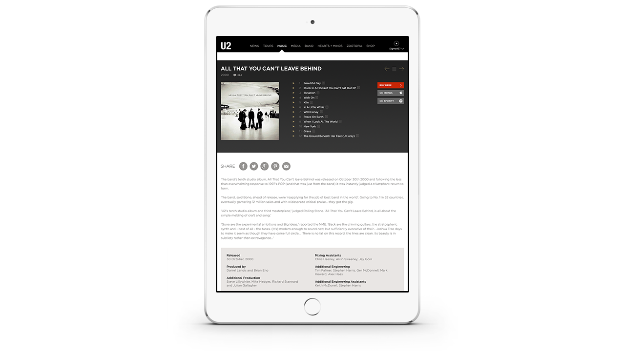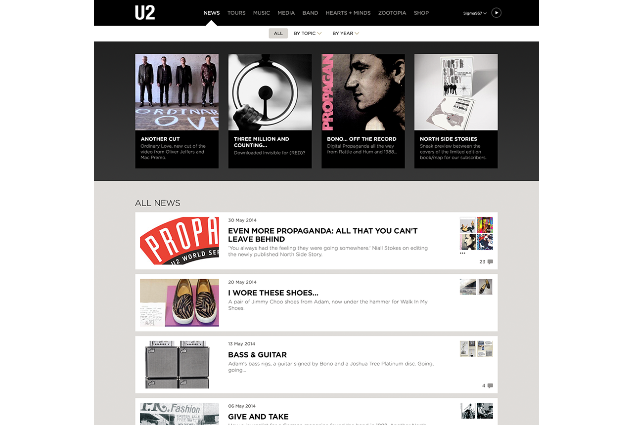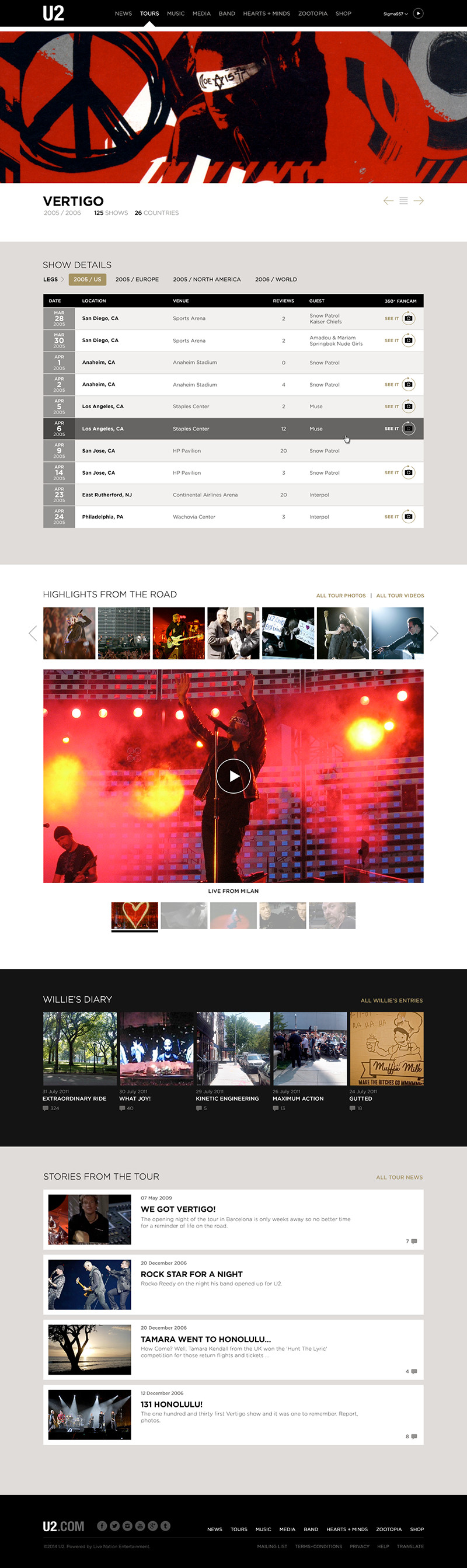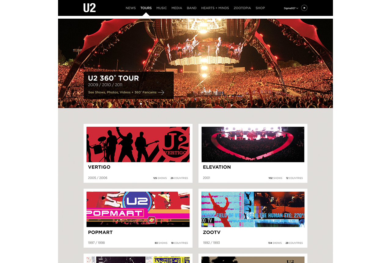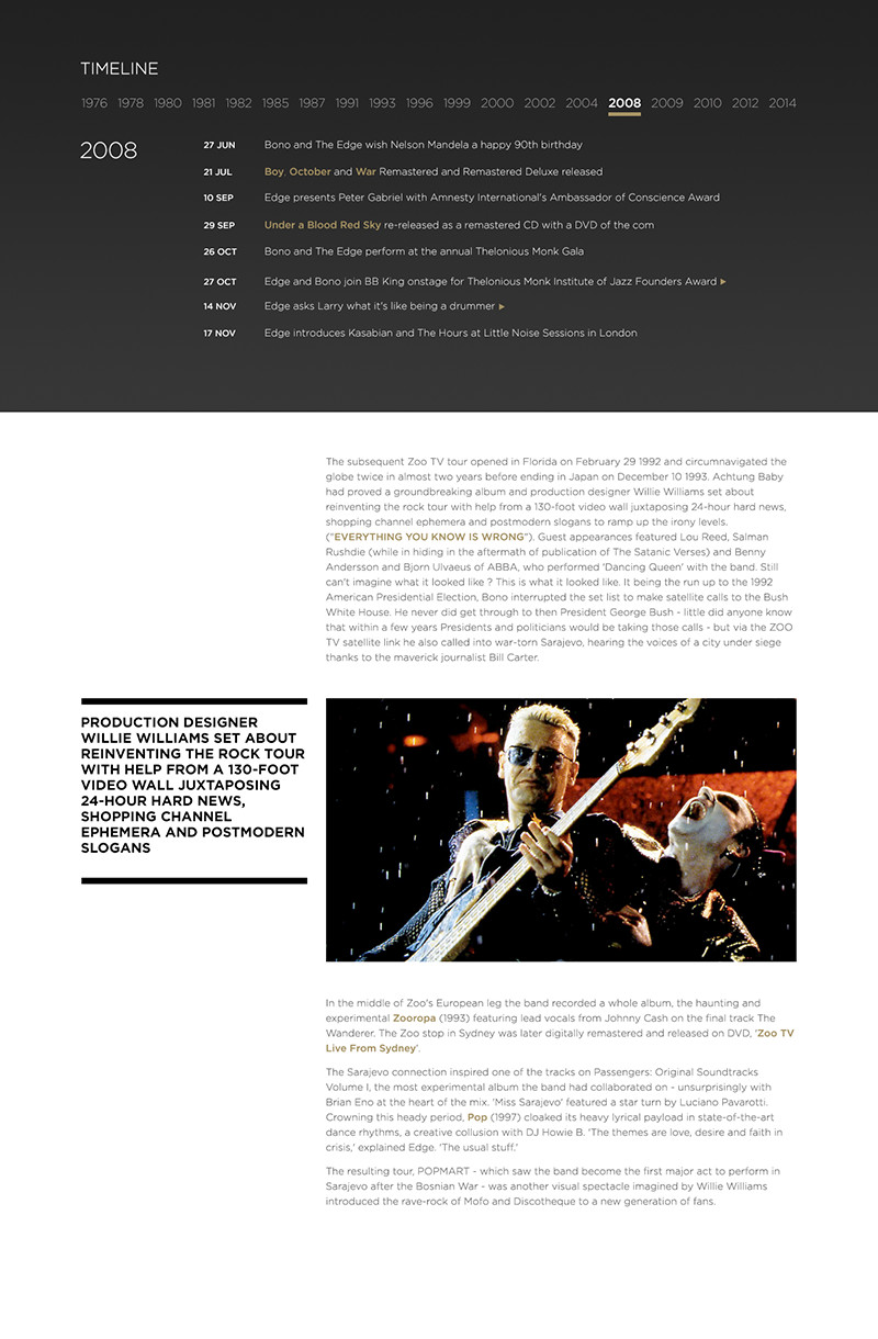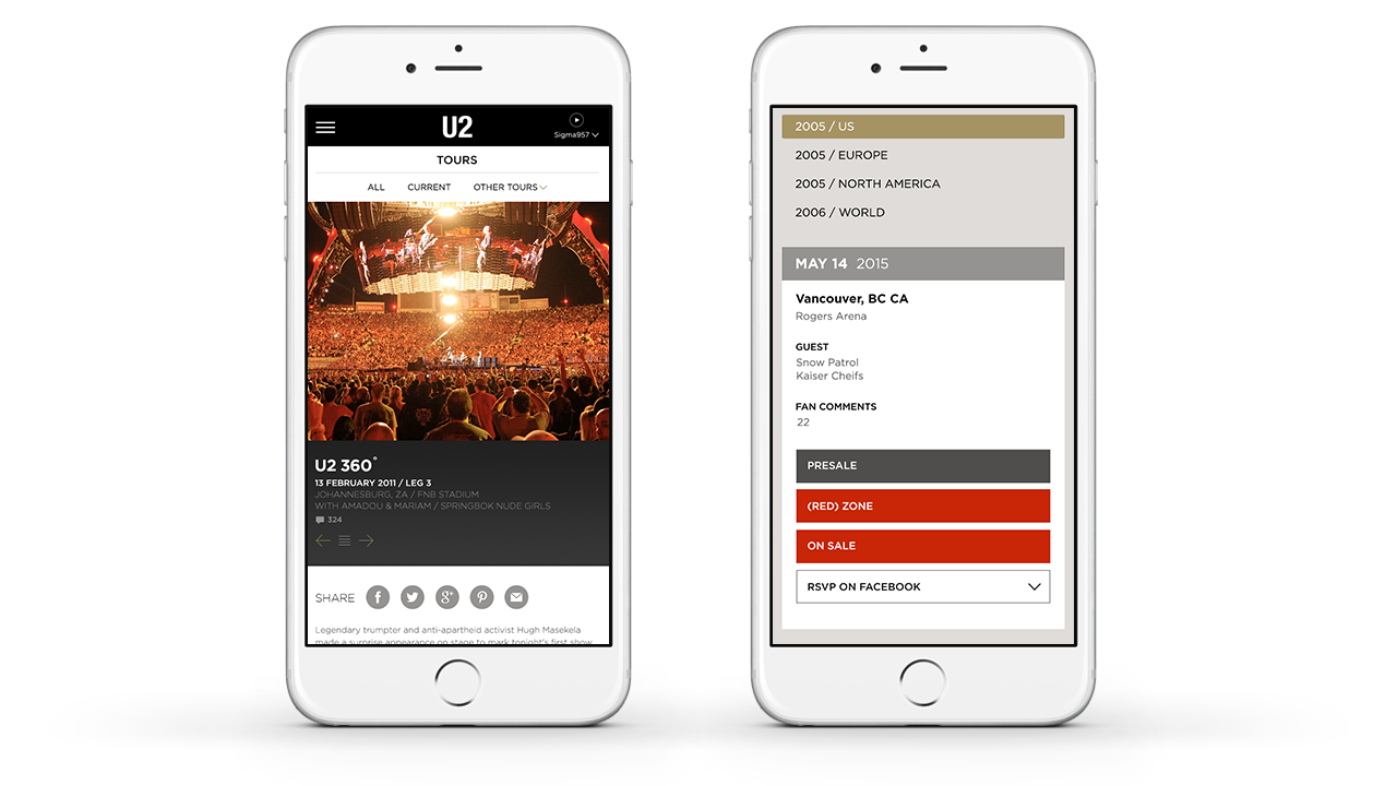 U2 asked us to rethink the structure and design of their web presence ahead of their latest album launch and tour. Working directly with band management and Live Nation, we focused on the live experiences that are so central to the band’s appeal, and on paying reverence to their significant and truly singular history.
